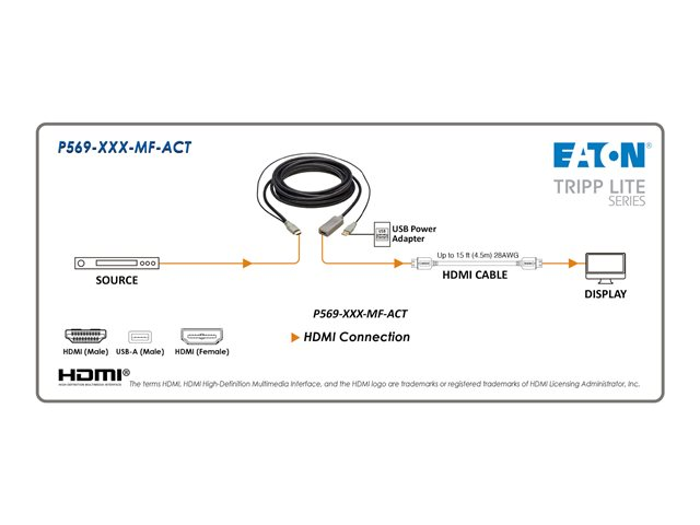 Eaton Tripp Lite Series HDMI Extension Cable with Active Repeater (M/F), 4K 60 Hz, HDR, 4:4:4, HDCP 2.2, 20 ft. (6.1 m), TAA - HDMI-förlängningskabel - TAA-kompatibel - 6.1 m - svart - aktiv förstärkare
