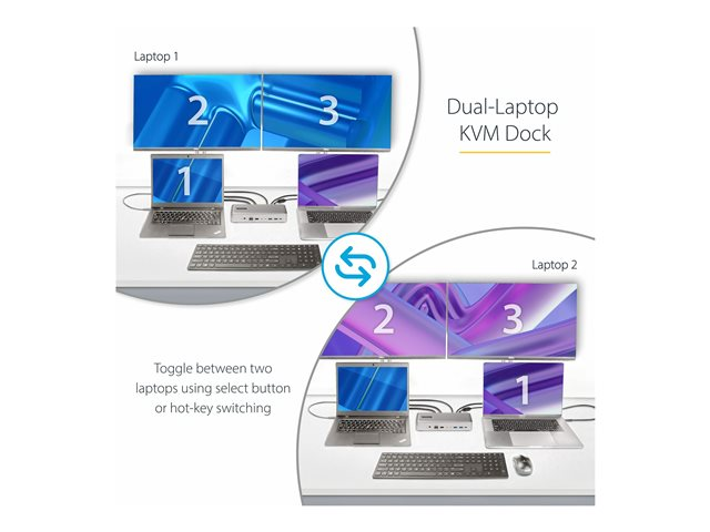 StarTech.com Dual-Laptop USB-C KVM Docking Station, Dual Monitor 4K 60Hz DisplayPort Dock, 5-Port USB Hub, GbE, 90W/45W Power Delivery to Two Laptops, Windows/Mac, 2-Host KVM Dock - dockningsstation - USB-C 3.2 Gen 2 - 2 x DP - 1GbE - TAA-kompatibel